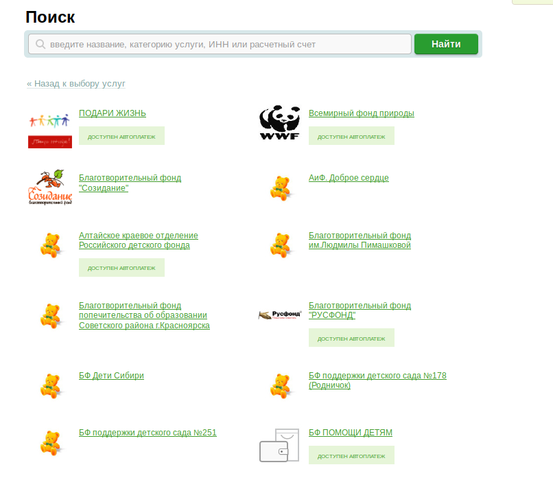 3. Выберите из списка услуг раздел фондов: БФ Дети Сибири